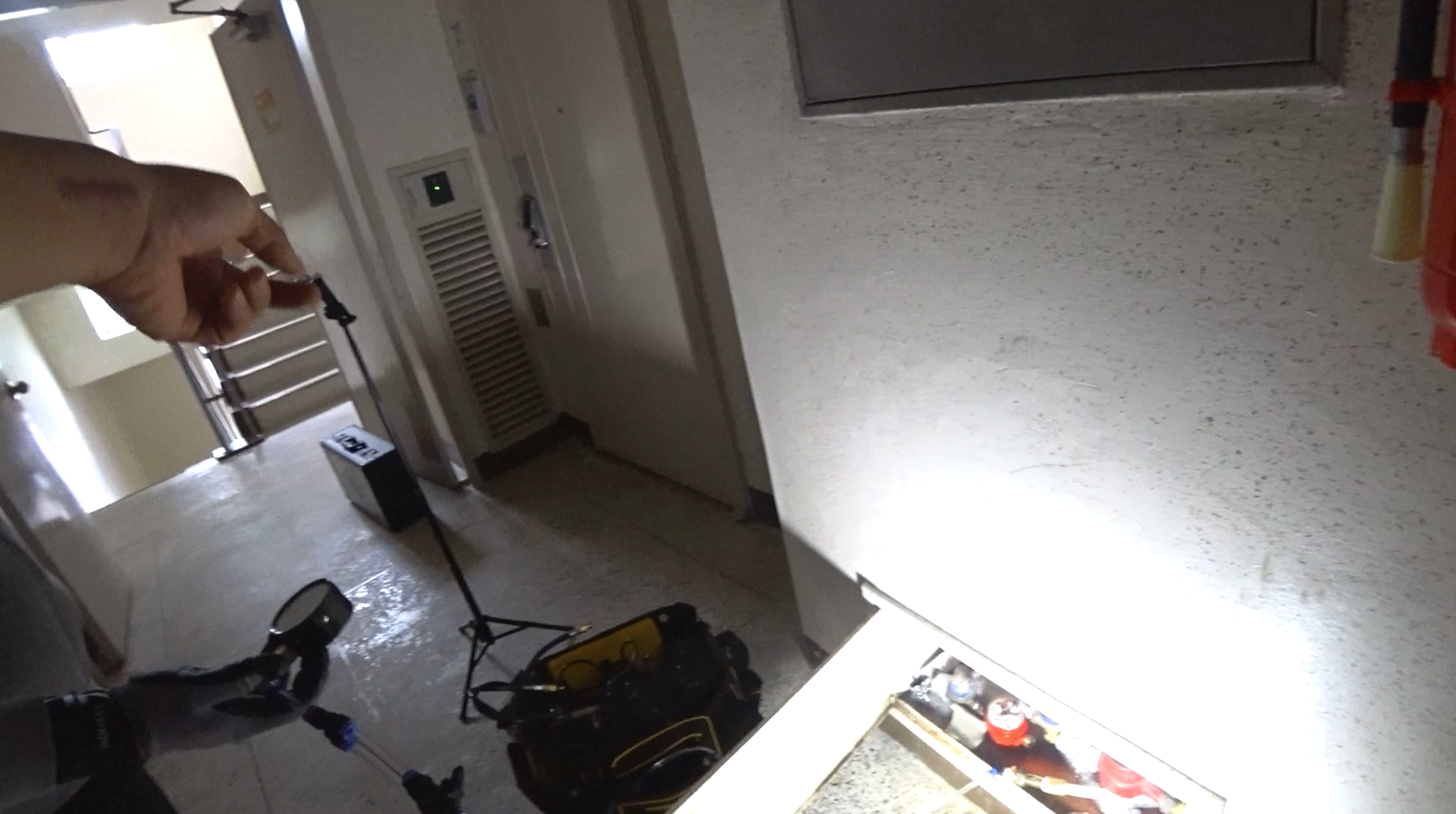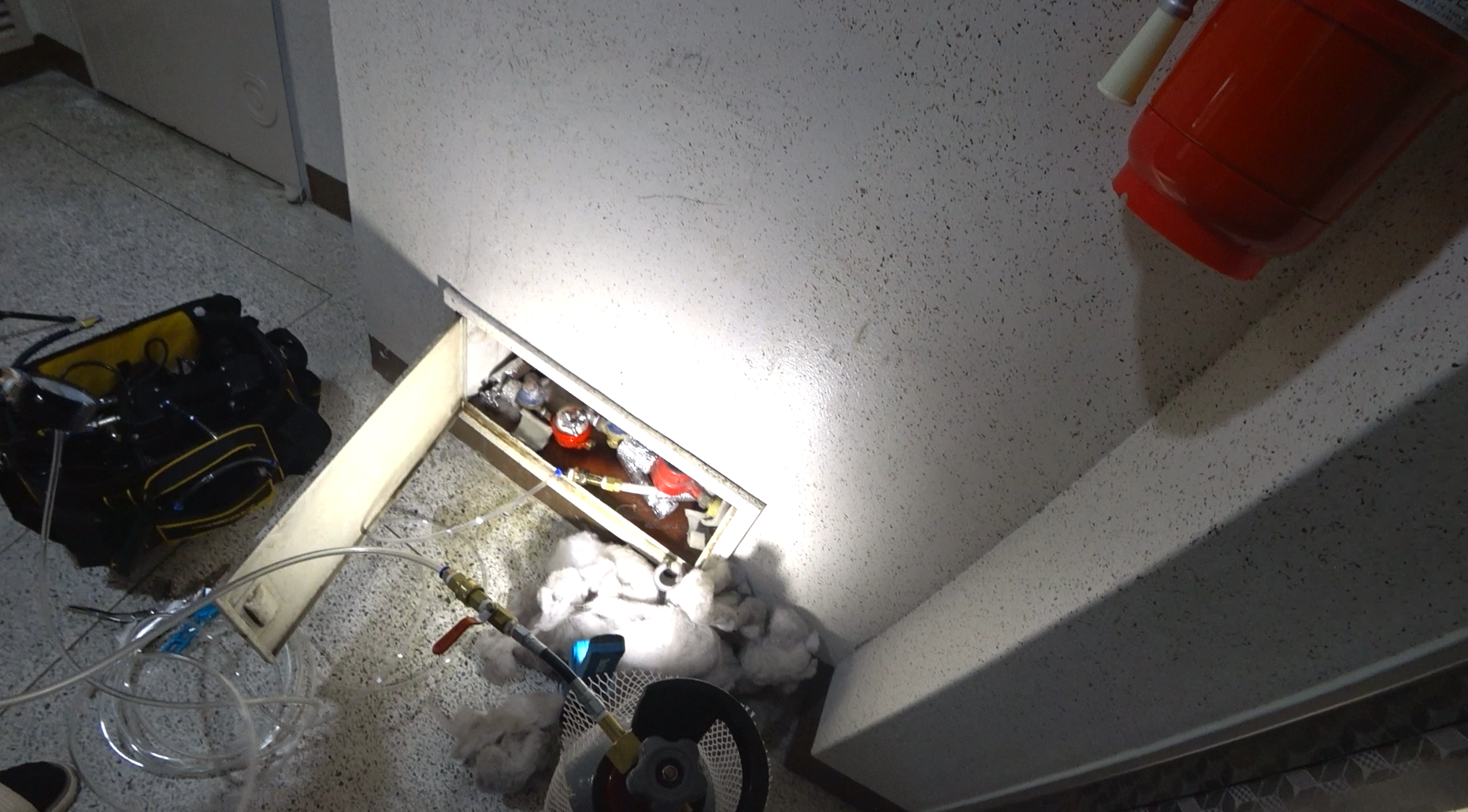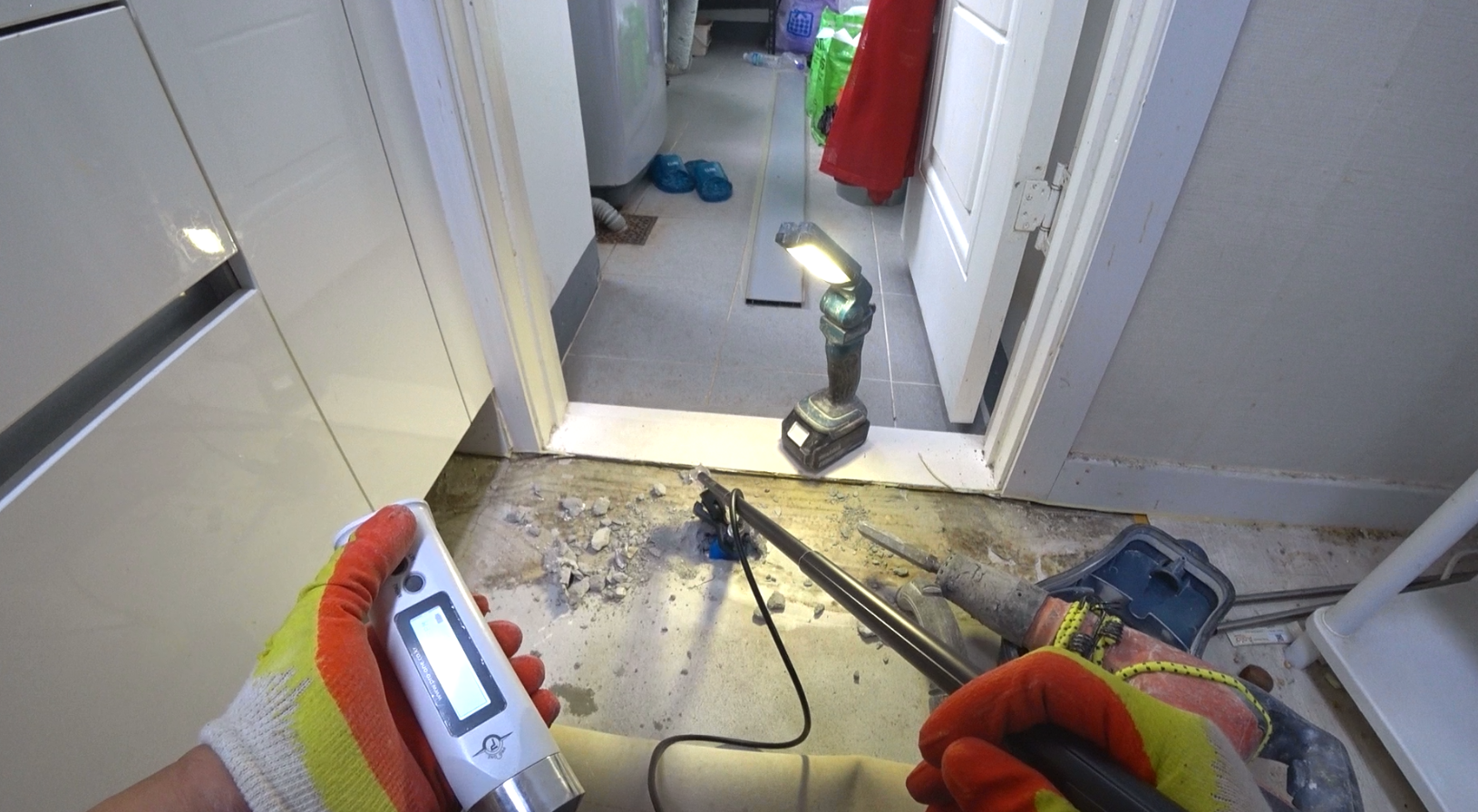 온수배관에 혼합가스를 주입하고 가스 수치를 측정해봤더니 거실 벽 근처에서 높은 농도가 나왔고,