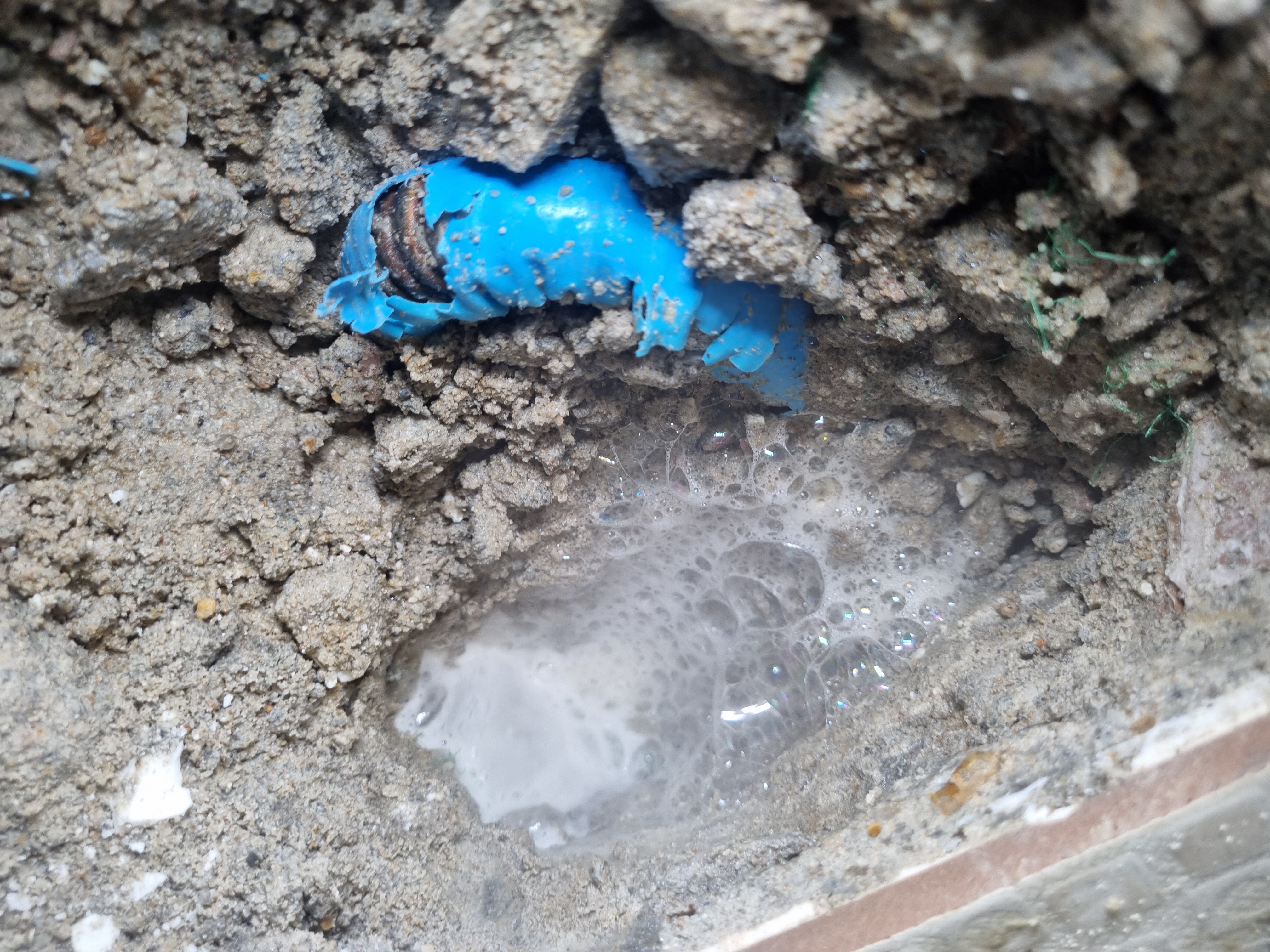 굴착을 마치고 나니 손상된 파이프가 드러났고, 이곳은 동배관이 사용된 상태였습니다.